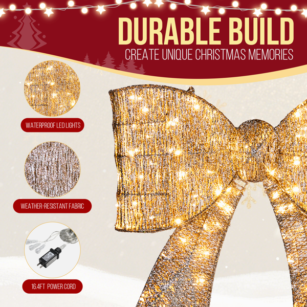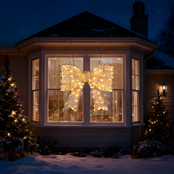 Bring festive cheer to your home this holiday season with our stunning pre-lit outdoor bowknot. Designed to add a touch of warmth and elegance to any space, this giant bowknot is the perfect centerpiece for your front door, porch, or gate. Its large size makes it a standout addition to your holiday decor, creating an inviting atmosphere for friends, family, and guests. With weather-resistant materials and sturdy construction, this bowknot is built to withstand the elements, ensuring it remains a beautiful part of your celebrations year after year. Easy to set up and store, it's the perfect combination of style and convenience for your seasonal decorating needs.